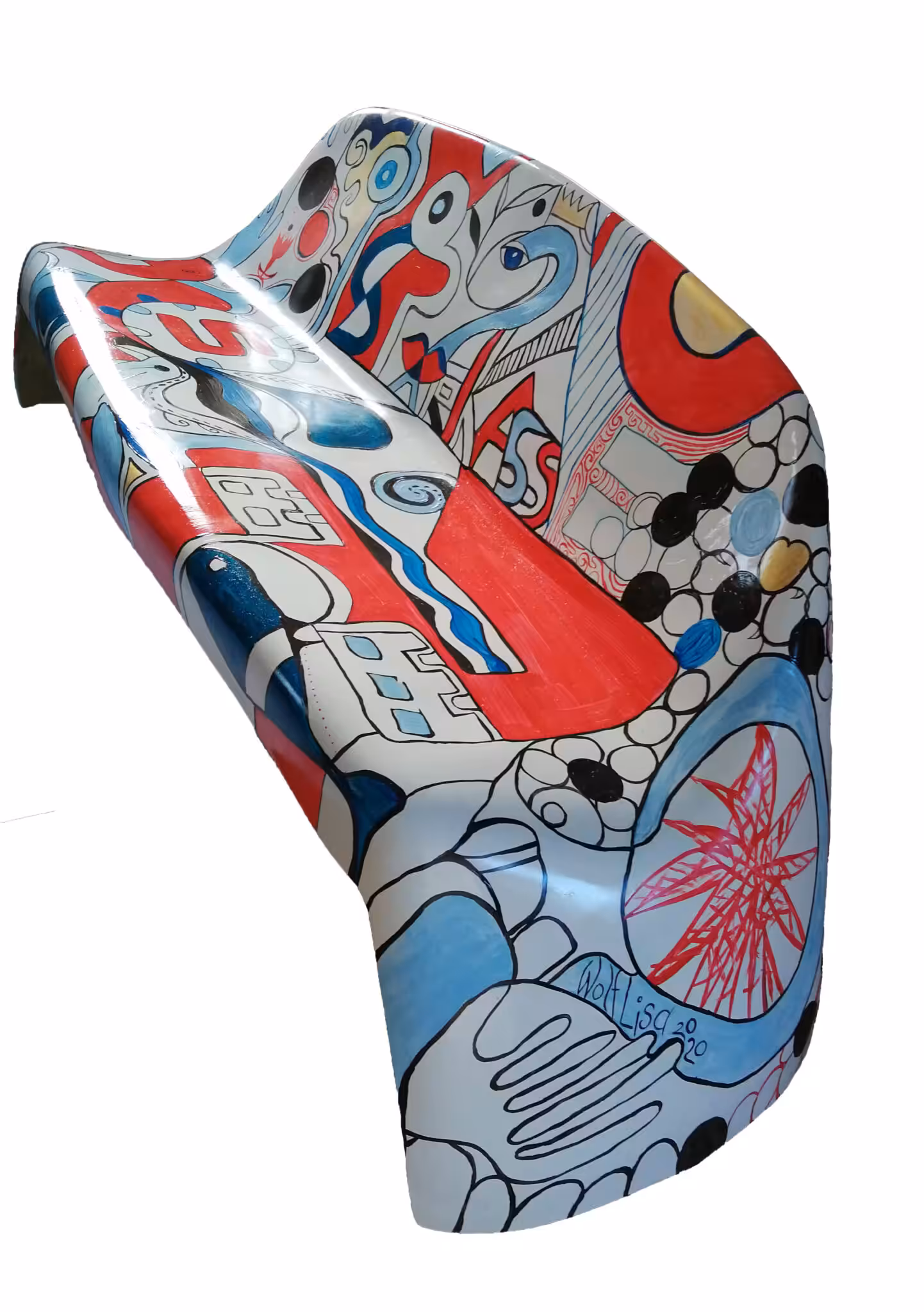 Bank und Psyche interagieren, erzeugen Momente der Innenschau. Es ist ein Ruhen auf einem Lisa Wolf Bildmotiv. Das Wirken der Formen, Farben, Linien, Zeichen wird zur Einheit: Kunst-Mensch wird wahrgenommen.
